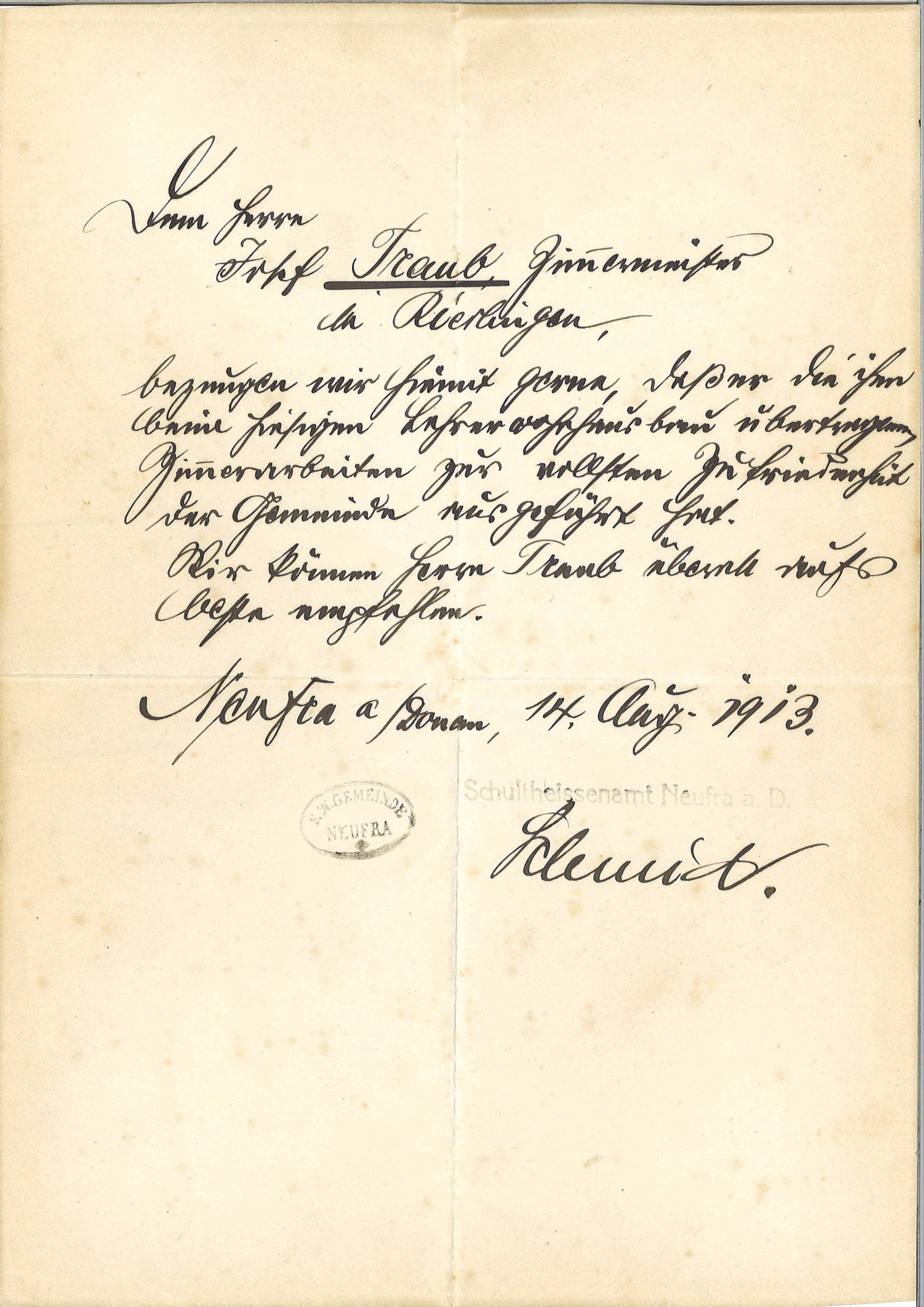 Auch schon vor über 100 Jahren haben wir uns mit dem Wohnungsbau beschäftigt. Hier ein Empfehlungsschreiben vom Schultheiß der königlich-württembergischen Gemeinde Neufra a.D. aus dem Jahr 1913 für den Zimmermeister Josef Traub in Riedlingen (in altdeutscher Schrift):